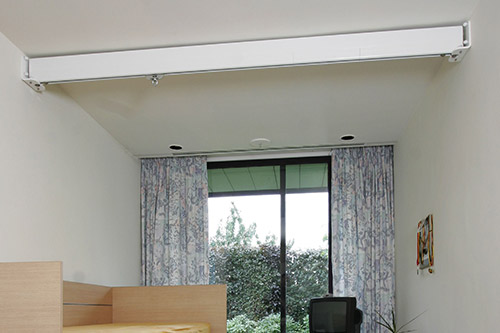 Eigenlijk zou je het geen plafondlift noemen, simpelweg omdat het niet aan je plafond maar aan je tegenoverliggende muren gemonteerd is. Dit is een goede oplossing als er ergens toch een beperking is om de plafondrails aan je plafond te monteren. Omdat dit type plafondrail extra hoog is, is de rail sterker en kan de rail een overspanning aan tot wel 7 meter. Hierdoor hoef je de plafondrail niet aan het plafond te monteren als je de rail aan twee muren bevestigt. Dat is handig bij bijvoorbeeld een extreem hoog plafond, meer dan 3,5 meter hoog, of wanneer het plafond niet genoeg draagkracht heeft of er technische installaties in de weg zitten. Voor jou als gebruiker en zorgverlener voelt het gebruik vrijwel hetzelfde aan als bij een gewone plafondrail, alleen is de bevestiging anders.